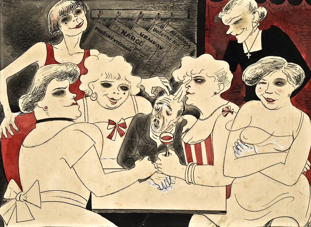 Otakar Mrkvička: V kavárně / 30. léta 20. století / akvarel a perokresba na papíře