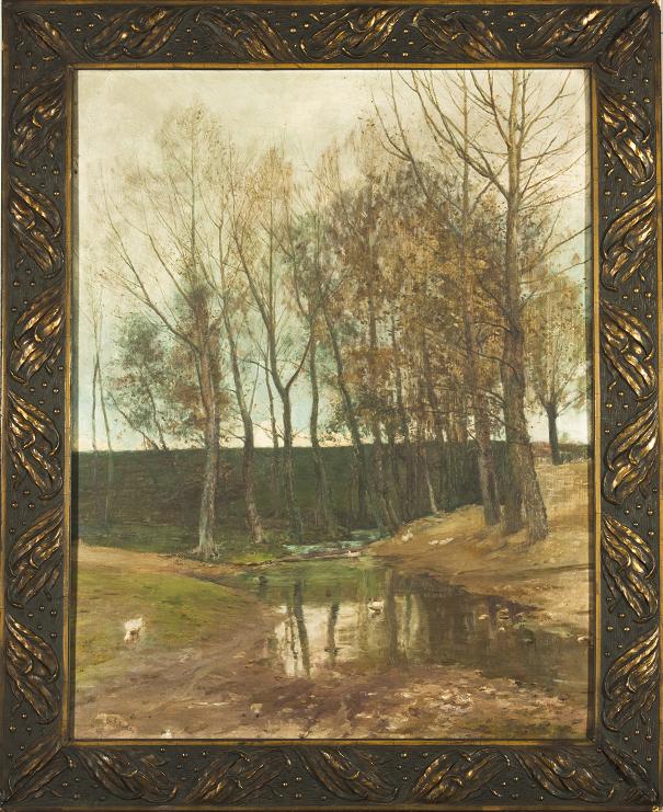 Lebeda Otakar: Hráz Okořského rybníka / 1895 / olej na plátně / 69 x 53 cm