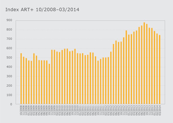 Index ART+ v březnu již šestý měsíc po sobě pokračoval v poklesu. Oproti svému maximu v září loňského roku za poslední půl rok ztratil 15,5 procent. Jeho aktuální hodnota 743,92 bodu přibližně odpovídá stavu na konci ledna 2013.