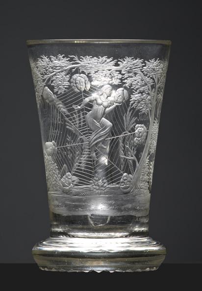 Na závěr bych se s vámi chtěl podělit o jeden jinotaj, který skrývá pohár řezaný v roce 1838 Morizem Oppitzem v Praze, který se bude taktéž dražit v prosincové aukci. Je na něm řezaná alegorie ženy – pavouka mezi mužskými hlavami a německý text, který by se dal přeložit takto: Kroť konečně svoje touhy, jinak Ti na konci nezůstane žádný viset! Není to krásné?