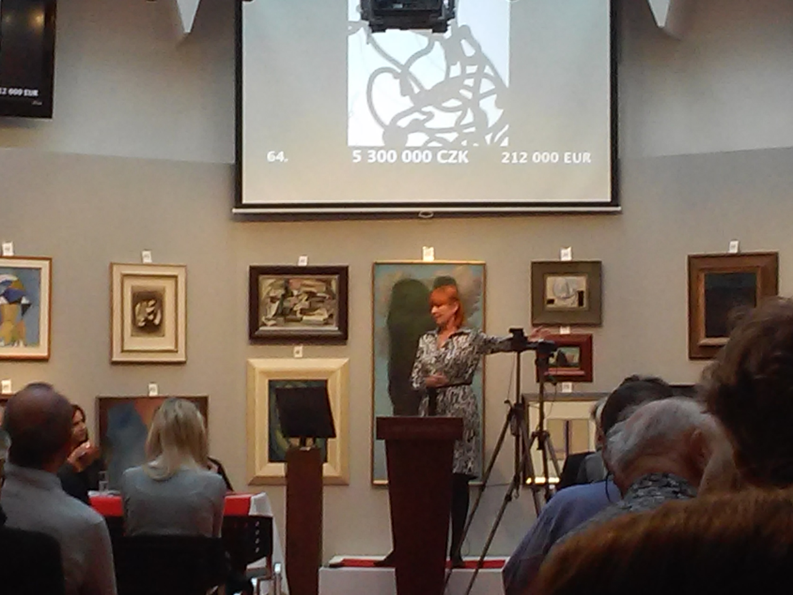 Zásadní malířův obraz ML známý pod několika názvy (více zde) přišel na řadu s katalogovým číslem 22. Utkali se o něj zájemce na telefonu a dáma v sále. Celkem mezi nimi padlo dvanáct příhozů po 250 tisících korunách. Na nabídku telefonního limitu 31 milionů korun již po několika minutách sběratelka ze sálu nezareagovala. Nový majitel na telefonu číslo 14 tak včetně složené provize ve výši 20% do 1 milionu korun, 18% do 10 milionů korun a 16% nad 10 milionů korun za obraz zaplatí bezmála 36,2 milionu korun. Aukční maximum do této doby držel obraz Ateliér prodaný před dvěma lety u Galerie Kodl za téměř 29 milionů korun (top 10).