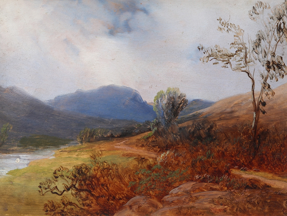 Tato líbivá komorní a na trhu zřídka se objevující práce je výtvorem uznávaného a velmi výjimečného malíře a kreslíře Antonína Mánesa. Malíř se odpoutává od zažitých forem romantických krajinomaleb, kdy signifikantním prvkem byla přítomnost hradní zříceniny či figurální stafáže a opouští tak trojí tematické rozdělení plátna. Krajina je nám tak představována ve své přirozené kráse. Pomocí krátkých tahů štětce vykresluje autor v pravé části obrazu pouze jeden strom společně s jednotlivými křovisky, které situuje do pravé prosvětlené části obrazu. Tmavé pozadí je tvořeno jednotlivými kopci, jež jsou malířem ochuzeny o sluneční paprsky. Plátno je pak doplněno jemně modelovanou kupou oblaků, která jen namátkově propouštějí sluneční svit. Dochází tak k dokonalé světelné hře, jež vykresluje atmosféru celého výjevu.
