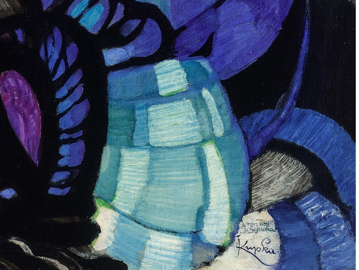 Detail signatury a dedikace na obraze Příliv a odliv Františka Kupky. Zdroj: Sotheby’s Odborníci dávají tento nepřehlédnutelný fakt do souvislosti s prvním vlastníkem díla, Kupkovým přítelem a stejně angažovaným Čechoslovákem, odbojářem, původně malířem z pražské Akademie, Jaroslavem Šejnohou (1889-1982). Ten se do Francie vydal nejprve na uměleckou zkušenou, ale záhy po konci I. světově války vstoupil do diplomatických struktur nové republiky. Zastával postupně funkce konzulárního atašé, legačního tajemníka a osobního sekretáře vyslance v Paříži (1919-1923). S Františkem Kupkou si byli po léta blízcí a doprovodný text v katalogu upozorňuje na dedikaci „à mon ami J. Sejnoha“ (mému příteli J. Sejnohovi), která by měla potvrzovat věnování čerstvě dokončeného obrazu novomanželům, panu Jaroslavovi a jeho choti, Albertě roz. Jedličkové (1923).