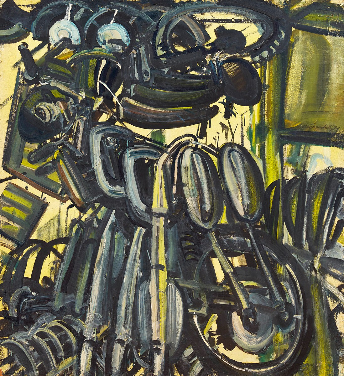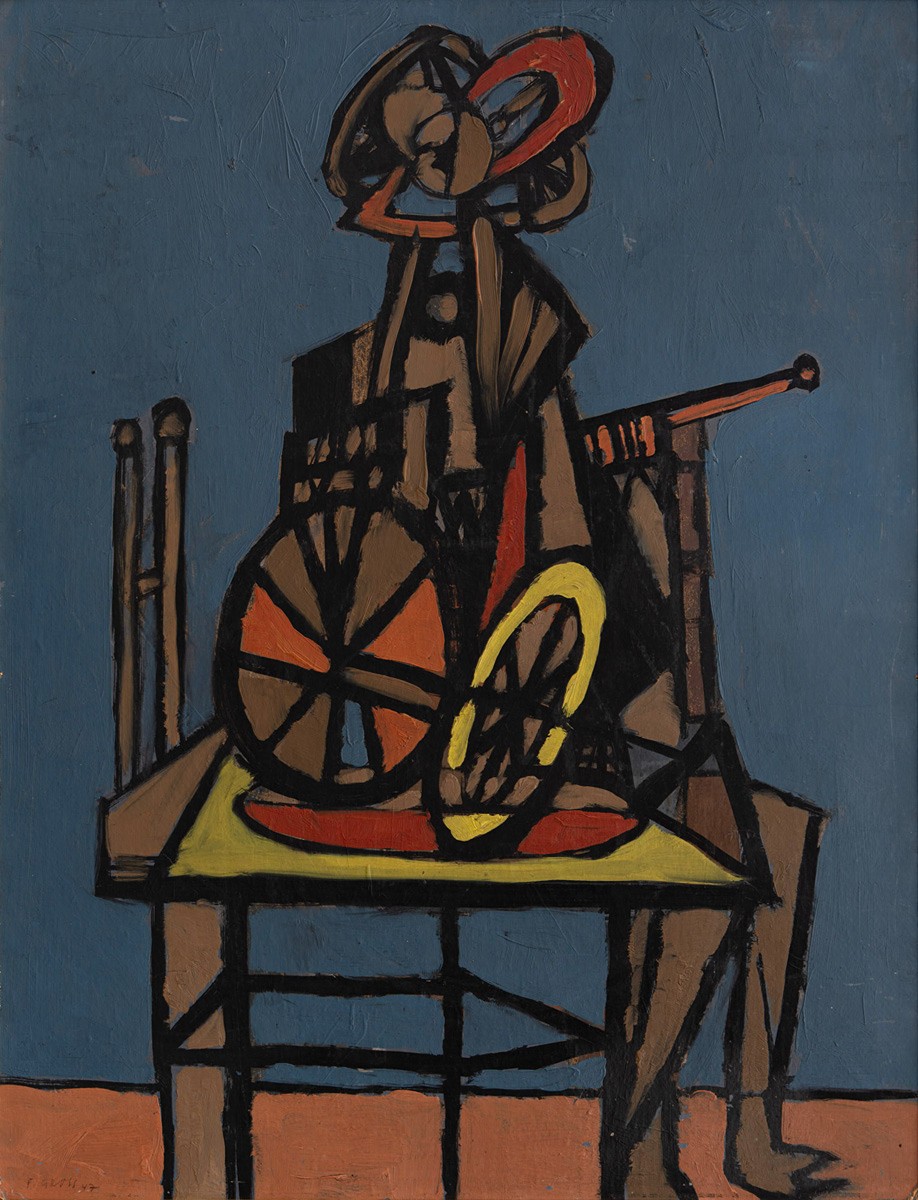František Gross: Figura, 1947,Nejotevřenější peněženku musel mít zájemce o větší obraz Františka Grosse s názvem Figura. Signovaný olej na sololitu pocházel z roku 1947, kdy byl jako čerstvý ateliérový kus poprvé – a na dlouhou dobu naposledy – vystaven na přehlídce Umělecké besedy ve Zlíně. V té době byl zralý výtvarník František Gross jejím členem, stejně jako jeho názorově spříznění kolegové z nedávno založené Skupiny 42. Tušená lidská postava, komponovaná z jakýchsi mechanických součástek, byla autorovou oblíbenou formou, jak osobitě nahlížet na úděl člověka v tísnivých 40. letech. Aukční katalog zmiňoval prezentaci obrazu v Galerii Moderna před třemi lety. Před publikum vstupovala Figura s vyvolávací cenovkou 992 tisíc korun vč. provize. A přesně tolik nakonec i stála.
