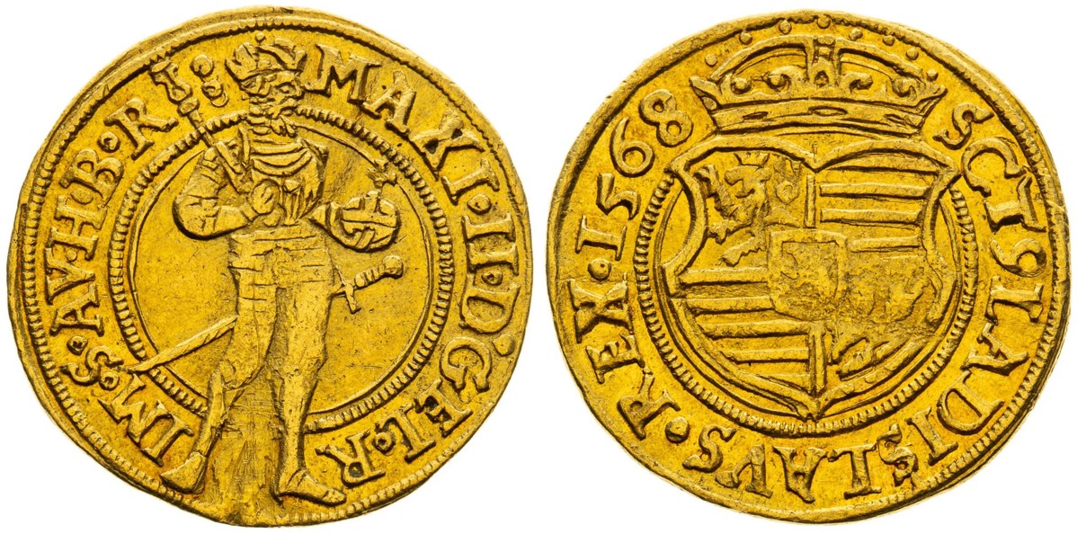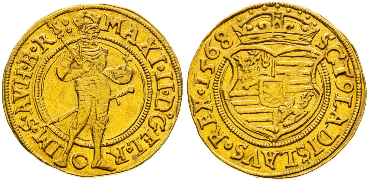 Mezi nejvzácnější české vládní dukáty Habsburků, které chybí v soukromých sbírkách a muzeích, včetně sbírky Wiener Münzkabinett, jednoznačně patří pražské dukáty císaře Maxmiliána II. Habsburského. Pro drtivou většinu sběratelů je to nepochybně jedna z nedosažitelných met. „Z roku 1568 existují pouze dva dochované exempláře, oba kusy najdete v mé sbírce. Známé jsou ještě dva kusy dukátů z roku 1566 ze sbírek Bergera a Donebauera, které se ale posledních 120 let na trhu již neobjevily a také jeden kus s ročníkem 1569 ze sbírky Horského, který byl prodán v roce 1978 na 22. aukci Rauch ve Vídni,“ uvedl před aukcí v rozhovoru Jaroslav Kokolus.