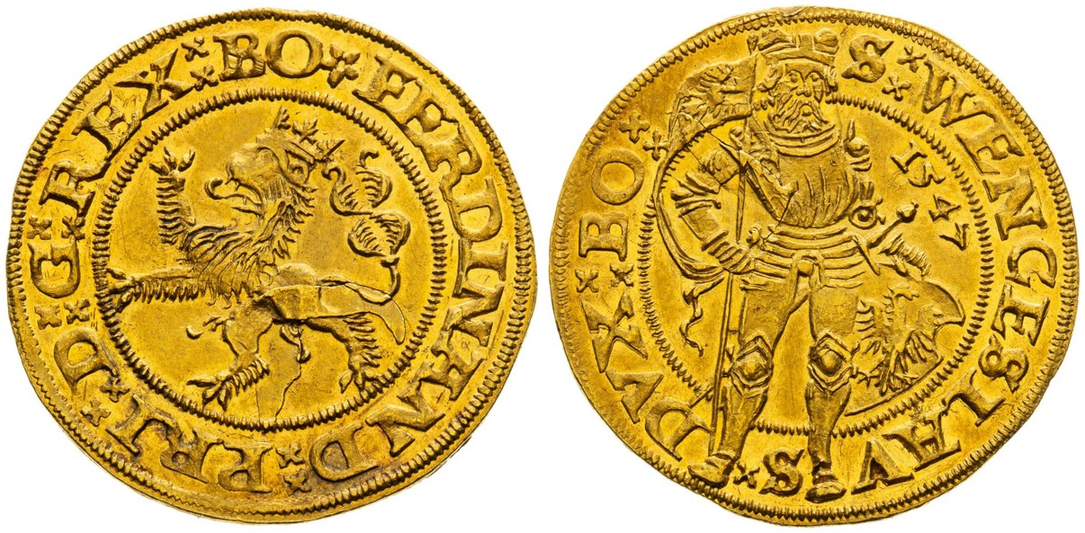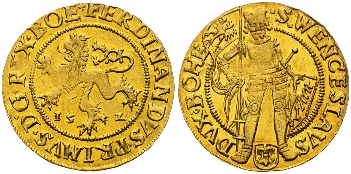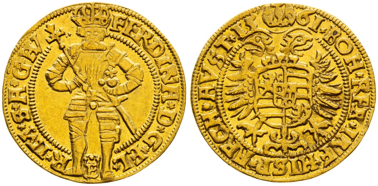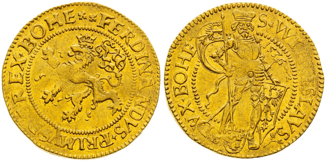 České dukáty Ferdinanda I. zpravidla na líci zobrazují českého lva a na rubu stojícího svatého Václava. Výjimkou je však unikátní, jednoročníkový typ pražského dukátu, zobrazující na líci stojícího Ferdinanda I., který je známý pouze v tomto jediném exempláři a nenachází se ani v nejvýznamnějších muzejních sbírkách, chybí dokonce i ve sbírce Wiener Münzkabinett. Exkluzivní exemplář s ražebním leskem v plochách vystřelil z částky 40 tisíc eur na více než trojnásobek vyvolávací ceny a nového nabyvatele tak vyšel na 3,6 milionu korun, včetně poplatků aukční síni.