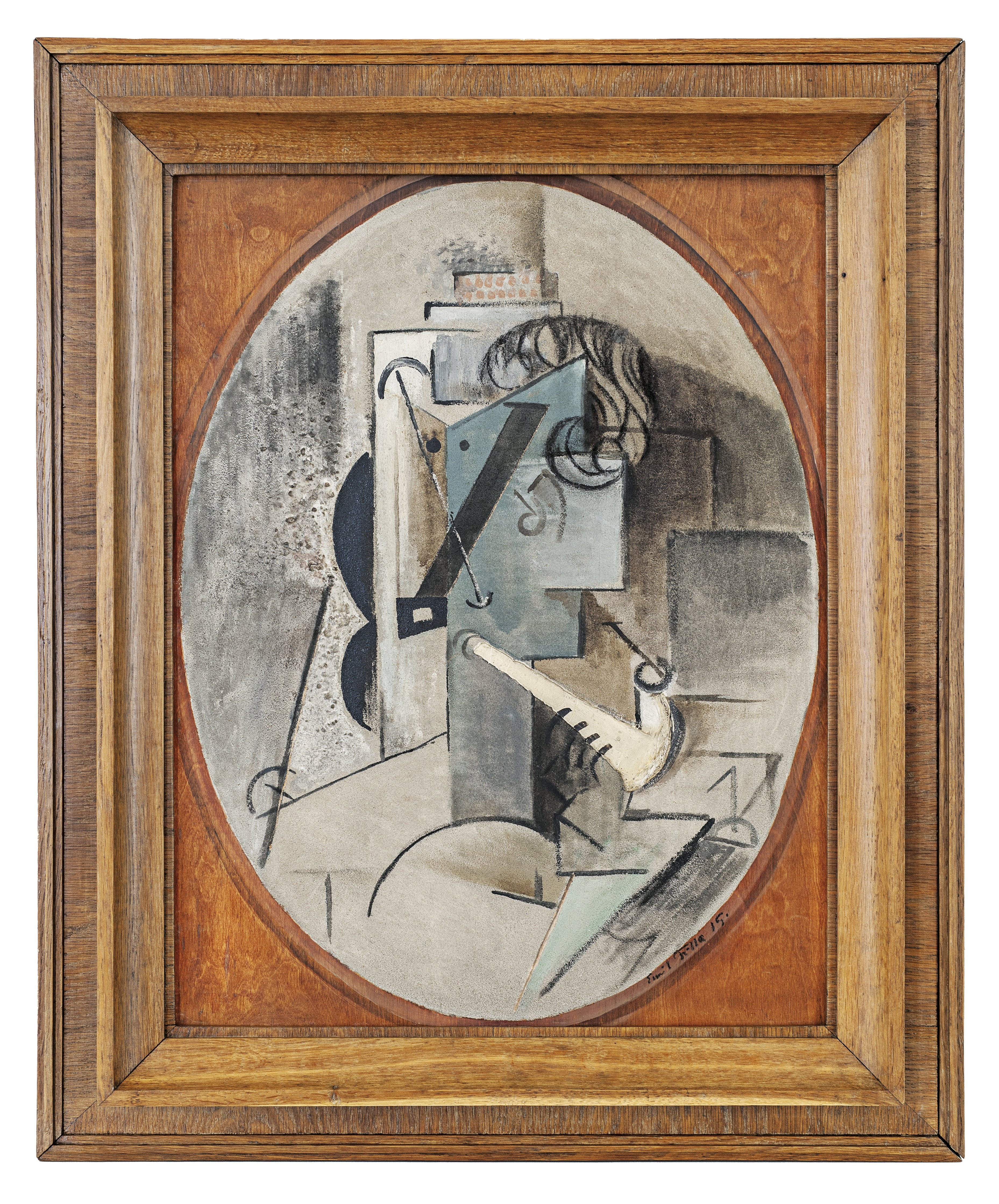 Emil Filla: Hlava muže s dýmkou, 1915,Na obraze bezprostředně upoutají dvě diagonály, jedna černá, připomínající nos, a jedna bílá, vyjadřující dýmku. Směřování obou těchto diagonál naznačuje prostorové rozpětí celé kompozice, složené z ortogonálních plánů, do nichž místy zasahují křivky vlasů. Filla, vycházející z osové symetrie, dosáhl až skulpturálního rozevření hlavy do všech stran. Za pozornost stojí způsob, jímž přecházel z kresebného rukopisu, vyjadřujícího hlavní osy hran, k plasticitě, docílené propojením písku a běloby, jež se volně rozprostraňuje v levé části nebo v hmotnosti, jíž provedl dýmku. Lze dokonce říci, že obraz přechází v nízký reliéf, píše Karel Srp ve svém posudku.