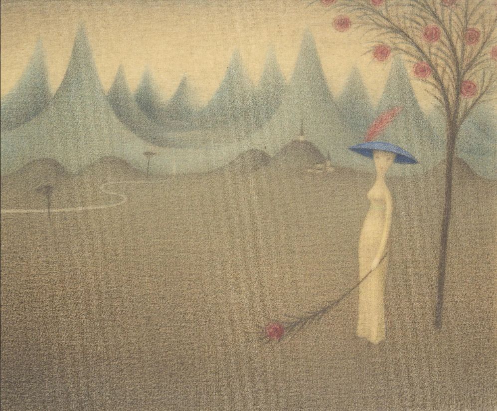 Ačkoli se to na předaukční výstavě v Topičově salonu přímo hemží rozměrnějšími díly umělců zvučných jmen nevyjímaje Mikuláše Medka, Josefa Šímu nebo Františka Kupku, náš pohled po chvíli zabloudí i na velmi drobný obraz s důvěrně známým motivem ženy v pusté fantaskní krajině umístěnou na stěně naproti vstupu, kresbu Údolí smutku II od dalšího velikána domácího umění Jana Zrzavého.