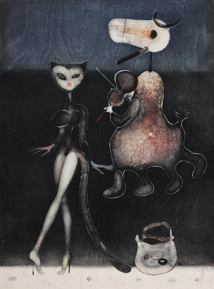 Na dohled sedmimístným částkám se v minulých týdnech přiblížil ještě například obraz slovenského malíře a sochaře Vladimíra Kompánka (1927-2011). U našich východních sousedů je poměrně etablovanou osobností se stovkami zápisů v dražebních listinách za objekty, obrazy, asambláže, kresby či grafiky. Tuzemské databáze vyhledaly přibližně sedmdesátku úspěšných prodejů za desítky, výjimečně nižší stovky tisíc korun. Metrová deska Turoň s mačkou (Tur a kočka) tak naskytla ojedinělou příležitost, jak umělce lépe představit. Nikoli však jedinou, neboť loňský říjnový první pokus o prodej za necelých 950 tisíc korun se nepotkal s poptávkou. Experti z brněnské Galerie Dílo tentokrát nacenili Kompánkovo zásadní téma 70. a 80. let, tedy fantasticko-erotickou sérii o turoňovi, folklórní masopustní masce, odvozené od reálného vyhubeného druhu pratura, a svůdné krásce s kočičí hlavou na téměř 350 tisíc korun. V době konání aukce, v polovině května, mělo umělcovo české maximum hodnotu přes 550 tisíc (Únos).