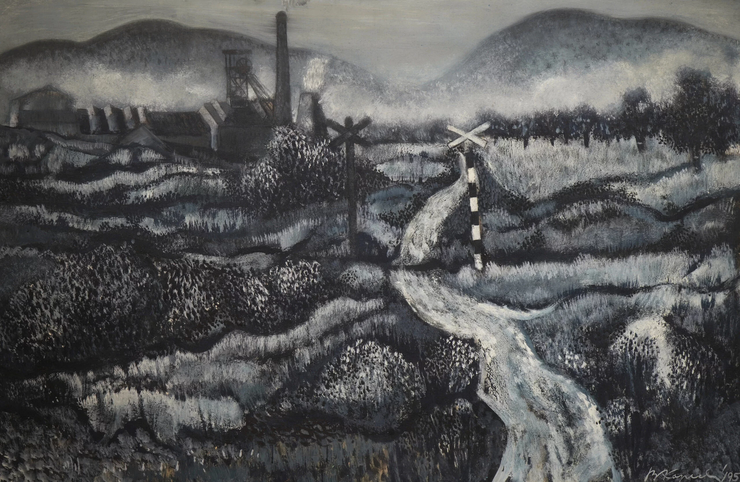 Bohdan Kopecký: Upadání do hlubin, 1973,Kopecký absolvovat Akademii s vynikajícím prospěchem naštěstí stihl, ale hned v roce 1950, kdy mu bylo nabídnuto ještě rok setrvat v ateliéru a užívat studentských výhod, byl novou vládnoucí garniturou odvelen na vojnu a pro svoji údajnou politickou nespolehlivost a nenávist k lidově-demokratickému zřízení zařazen do pomocných technických praporů. Jeho úkolem na dalších pět let mělo být fárání na Karvinsku a především na Mostecku, kde zůstal i dlouho potom, co v polovině 50. let ukončil hornickou profesi. Od té doby intenzivně maloval, pravidelně vystavoval a účastnil se místního uměleckého provozu prostřednictvím členství v severočeské pobočce Svazu československých výtvarných umělců. Divoká a zároveň kvůli těžbě často neutěšená krajina mu poskytovala cenné inspirační zdroje.