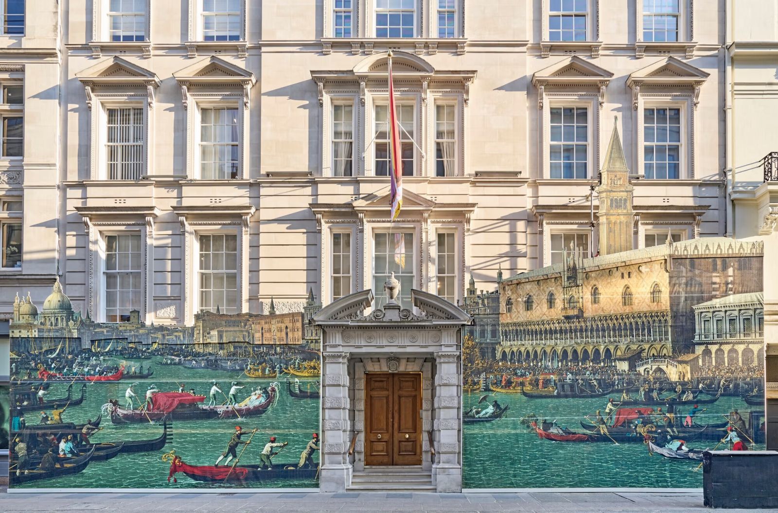 Promokampaň ke staromistrovské aukci 1. července 2025 na fasádě centrály společnosti Christie’s na Kings Street v Londýně. Detail z Canalettova obrazu Benátky. Zdroj: Christie’sU společnosti Christie’s se začínalo dražit v úterý 1. července. S nejvyššími ambicemi vstupovalo do licitace velké plátno italského mistra městské krajinomalby, Canaletta, které se navíc pyšnilo unikátní vlastnickou historií. Reprezentativní scenérie Benátky, Návrat galéry Bucintoro v den Nanebevstoupení Páně (Venice, the Return of the Bucintoro on Ascension Day) se záhy po svém vzniku počátkem 30. let dostala do Velké Británie, do kolekce vlivného sběratele a politika sira Roberta Walpola. Ten působil v letech 1721 až 1742 v roli historicky prvního premiéra a díky králem věnovanému londýnskému paláci založil tradici ministerského sídla v Downing Street 10.