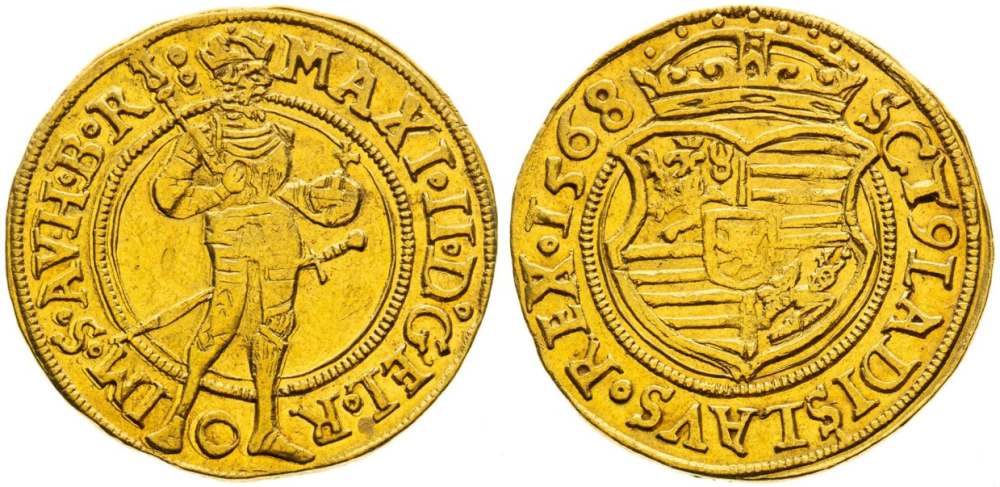 Mezi nejvzácnější české vládní dukáty Habsburků obecně, které chybí v soukromých sbírkách a muzejích, včetně sbírky Wiener Münzkabinett, jednoznačně patří pražské dukáty císaře Maxmiliána II. Habsburského. Pro drtivou většinu sběratelů je to nepochybně jedna z nedosažitelných met. Z roku 1568 existují pouze dva dochované exempláře, oba kusy najdete v mé sbírce. Jeden z nich je v krásné kvalitě a ten druhý má zase mimořádně doložený původ, pochází totiž ze sbírky Horského a byl též ve sbírce Hanse Dietikera. Je otázkou, kdo z potenciálních zájemců více preferuje kvalitu a kdo více původ draženého exempláře. Osobně hodně preferuji původ mince a u stejně vzácných mincí v téže kvalitě bych si vybral minci s významným a doloženým původem. Za takovou minci, která prošla sbírkou například Maxe Donebauera, Horského sbírkou, či jinou stejně významnou, bych neváhal zaplatit i o padesát procent více. Známé jsou ještě dva kusy dukátů z roku 1566 ze sbírek Bergera a Donebauera, které se ale posledních 120 let na trhu již neobjevily a také jeden kus s ročníkem 1569 ze sbírky Horského, který byl prodán v roce 1978 na 22. aukci Rauch ve Vídni.