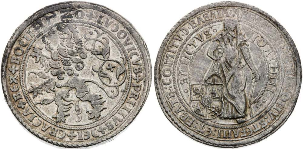Štěpán Schlik a bratřiDaleko větší vzácností je však jeden a půl tolar z Jáchymovské mincovny mincmistra Wolfa Sturze, který je jediným známým exemplářem vůbec a navíc je to týž exemplář, který je vyobrazen v soupisu sbírky Maxe Donebauera, což značně přidá na jeho žádanosti. Nepochybně si zaslouží mnohem vyšší docílenou cenu než exkluzivní dvoutolar s letopočtem 1520, ale to uvidíme při aukci.