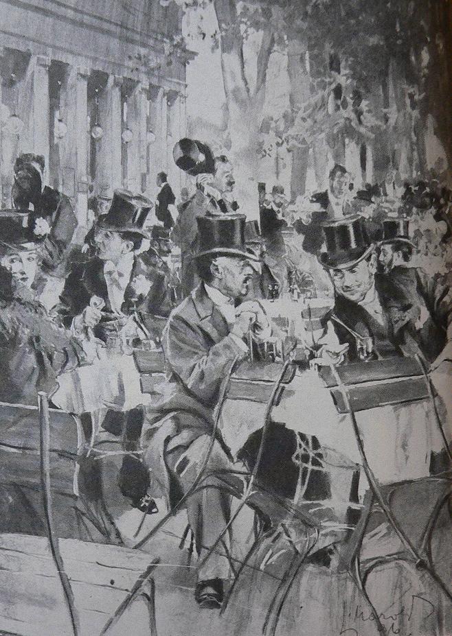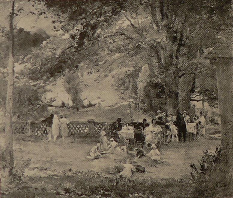 Luděk Marold: V lesní restauraci / lavírovaná tuš a akvarel na papíře / reprodukováno v Maroldově albu