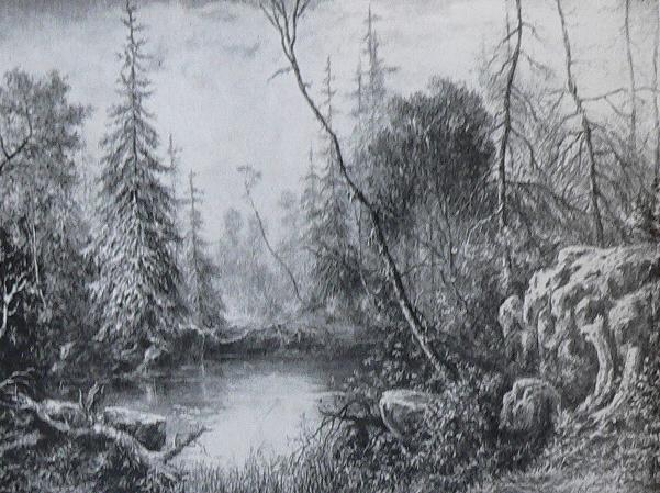 Julius Mařák: Lesní jezírko / uhel na kartonu / 77 x 99 cm / s poznámkou vystaveno v NG r. 1950