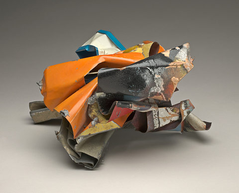 Objekt Johna Chamberlaina z roku 1962 obsahující rozdrcenou karoserii auta a dřevo,