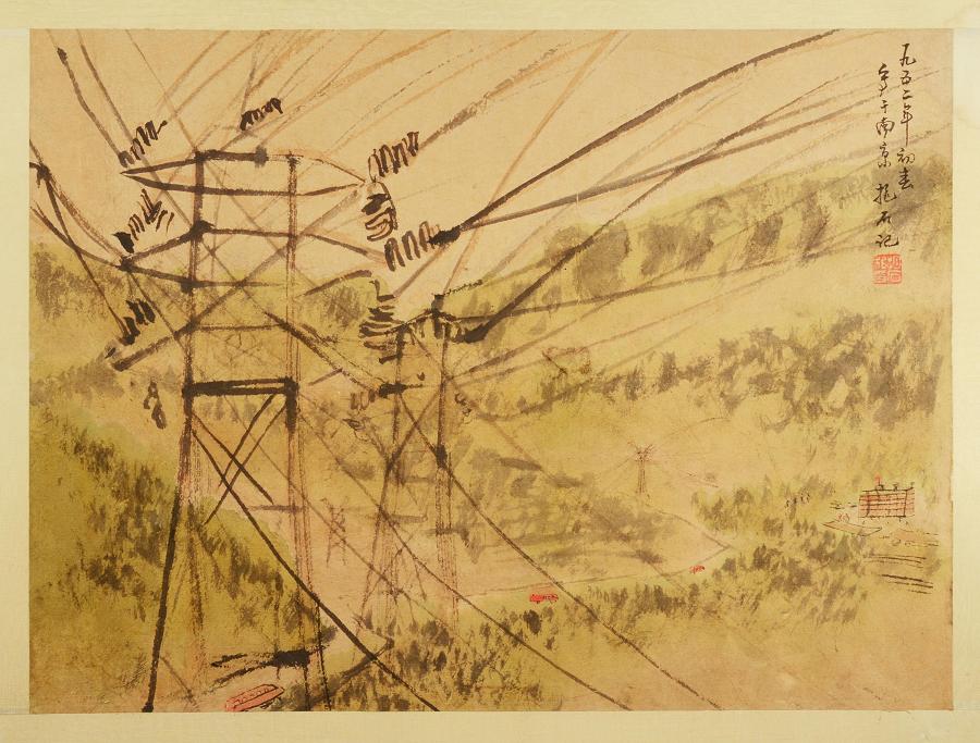 Fu Baoshi: Elektrické vedení v krajině / 1952 / Čína, Nanking / komb. technika na papíře / 45,5 x 34 cm
