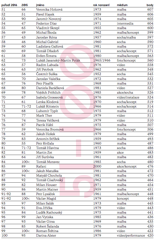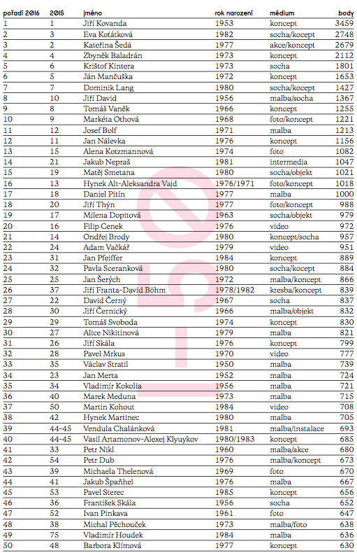 O jednu příčku svou pozici v první desítce vylepšil také Krištof Kintera, který měl loni velkou samostatnou výstavu v Kunsthal Rotterdam, a z desátého na osmé místo se posunul Jiří David. Ten loni nejen že úspěšně reprezentoval Česku republiku na Bienále v Benátkách, ale měl také průřezovou retrospektivu Moskevském muzeu současného umění a byl pozván na 2. bienále pořádané mnichovským Haus der Kunst.