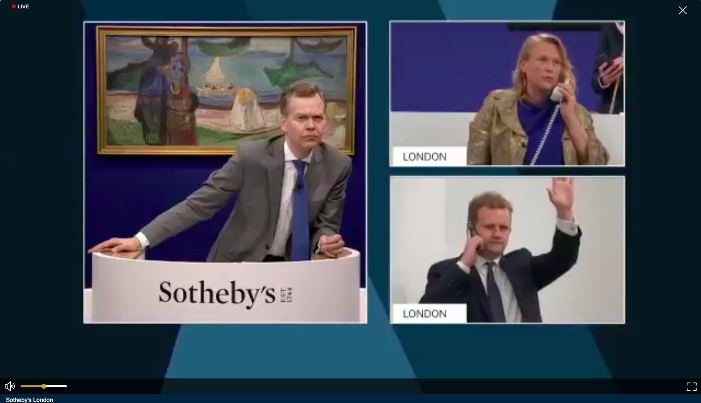Šlo o souboj tří telefonistů v Londýně. Z New Yorku a Hongkongu se do dražby nikdo nezapojil. To naznačuje, že obraz dražili zájemci z Evropy a dá se předpokládat, že mezi nimi byli Češi. Dva telefony obsluhovali specialisté na současné umění – šéf daného odboru v Londýně Alex Branczik, s kterým licitátor během dražby vtipkoval, že má české příjmení, a jeho kolega Hugo Cobb – u třetího telefonu byla odbornice na evropské malířství 19. a 20. století a šéfka odboru "Czech Art" Tessa Kostrzewa.