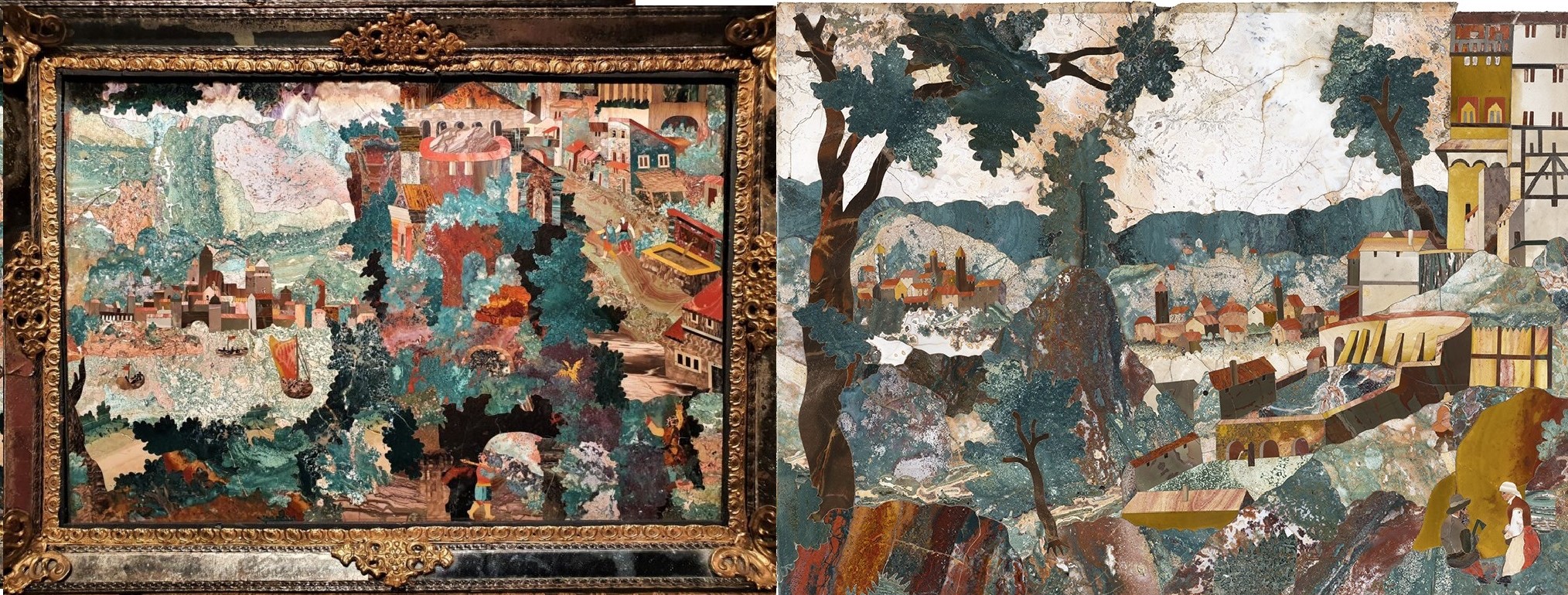 Pro TEFAF je typické bohaté zastoupení dobového uměleckého řemesla, nábytku či textilního mistrovství předchozích staletí. Pařížská Galerie Gismondi se mezi dalšími unikáty prezentovala i dvěma kamennými mozaikami Giovanni Castrucciho z doby kolem 1605 až 1610, kdy pracoval v brusířských a řezačských dílnách Pražského hradu a Císařského mlýna v Bubenči. Obě polodrahokamové desky, Pohled na Prahu a Pohled na Schwarzenberský palác, se patrně nacházely v proslulé Rudolfově kunstkomoře a představují to nejlepší z práce tří generací na císařském dvoře usazených Florenťanů. Technikou vykládání drahými kameny českého původu zhotovené dílo se stafáží v pravém dolním rohu se na trhu objevilo (v páru s další deskou) již před třemi lety za částku kolem 150 tisíc liber (druhá mozaika dokonce za 200 tisíc liber, přibižně 5,6 milionu korun). V obdobných hodnotách se pohybují i prodeje z minulých několika týdnů: Krajina s kaplí za necelých 164 tisíc eur u Sotheby´s v Paříži (14. června, asi 4,1 milionu korun) a Panorama s požárem Pražského hradu za 63 tisíc liber v londýnském sídle téhož dražebníka (5. července, necelých 1,8 milionu korun).