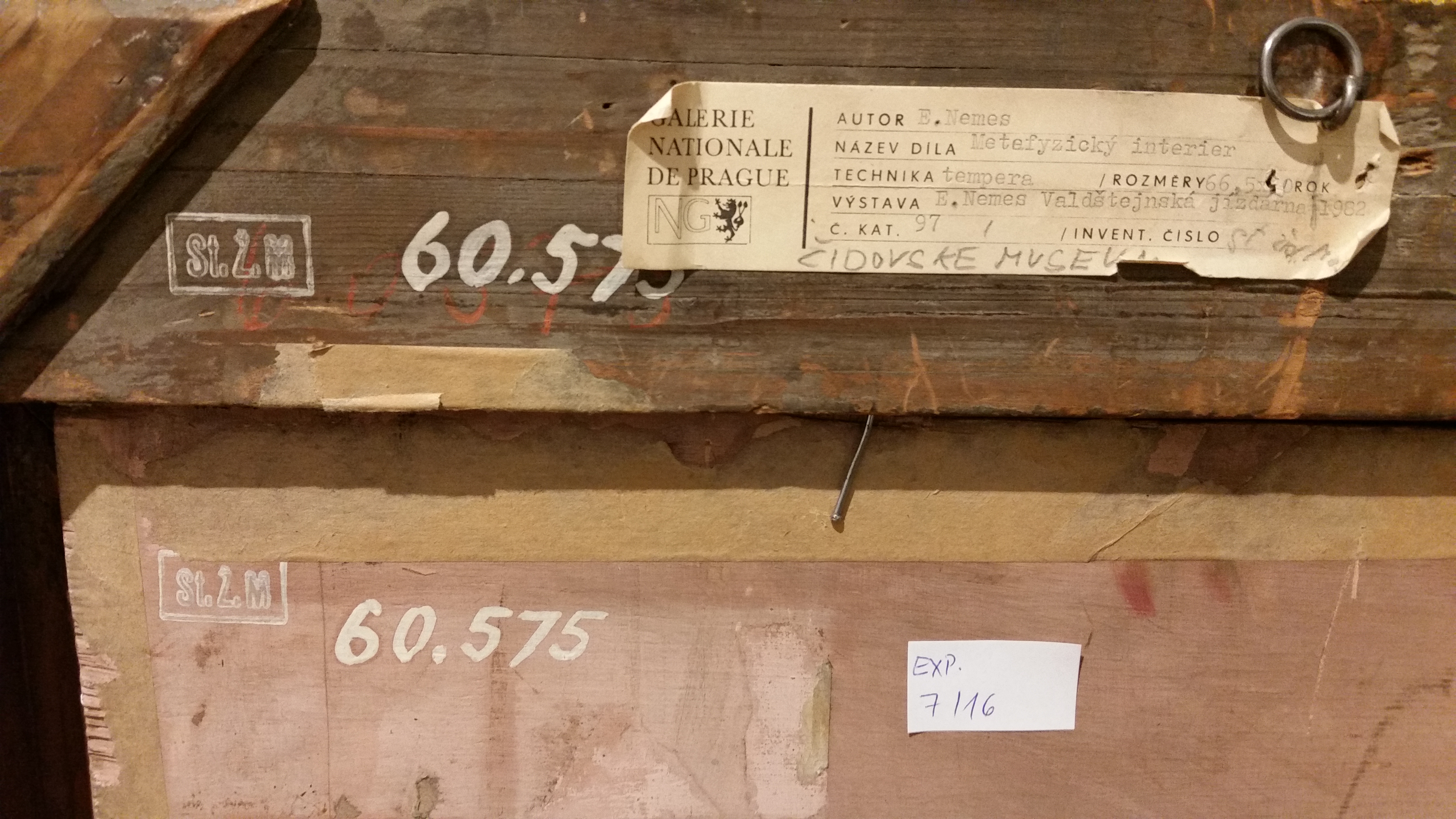 První z dvojice publikovaných prací, které ze soukromého majetku nyní nabídne Galerie Kodl, Metafycký interiér z roku 1937, nese typické kompoziční prvky surreálných kompozic těsně předválečného Nemesova díla: melancholickou postavu ženy u klavíru, rozevřený deštník, chaoticky rozmístěné kusy nábytku či antická torza, motiv rozbitých pendlovek upomínající na neúprosné míjení času. To vše v pozadí rámuje silueta potemnělé Prahy. Jakoby obrazy tohoto období zachytily beznadějný chaos a bezvýchodný smutek v domácnostech pražské židovské elity v posledních dnech předcházejících nucené emigraci: cennější kusy inventáře narychlo připravené k vystěhování či odprodeji, poslední melancholická gesta přátel; dosavadní život v troskách a ten nový s velkým otazníkem.