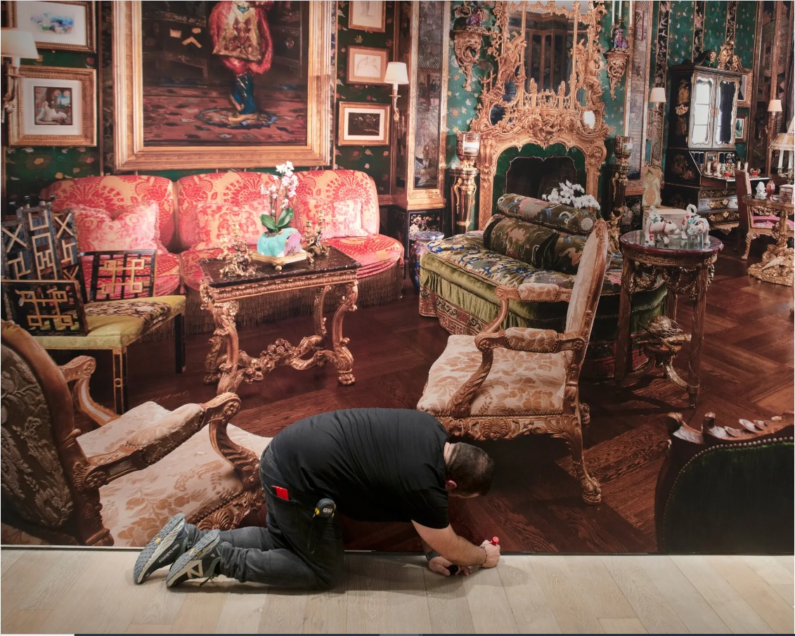 Instalace fototapety s pohledem do interiéru rezidence Gettyových v San Francisku v rámci předaukční výstavy v newyorské pobočce Christie´s. Série sálových aukcí probíhala od 20. do 23. října 2022.