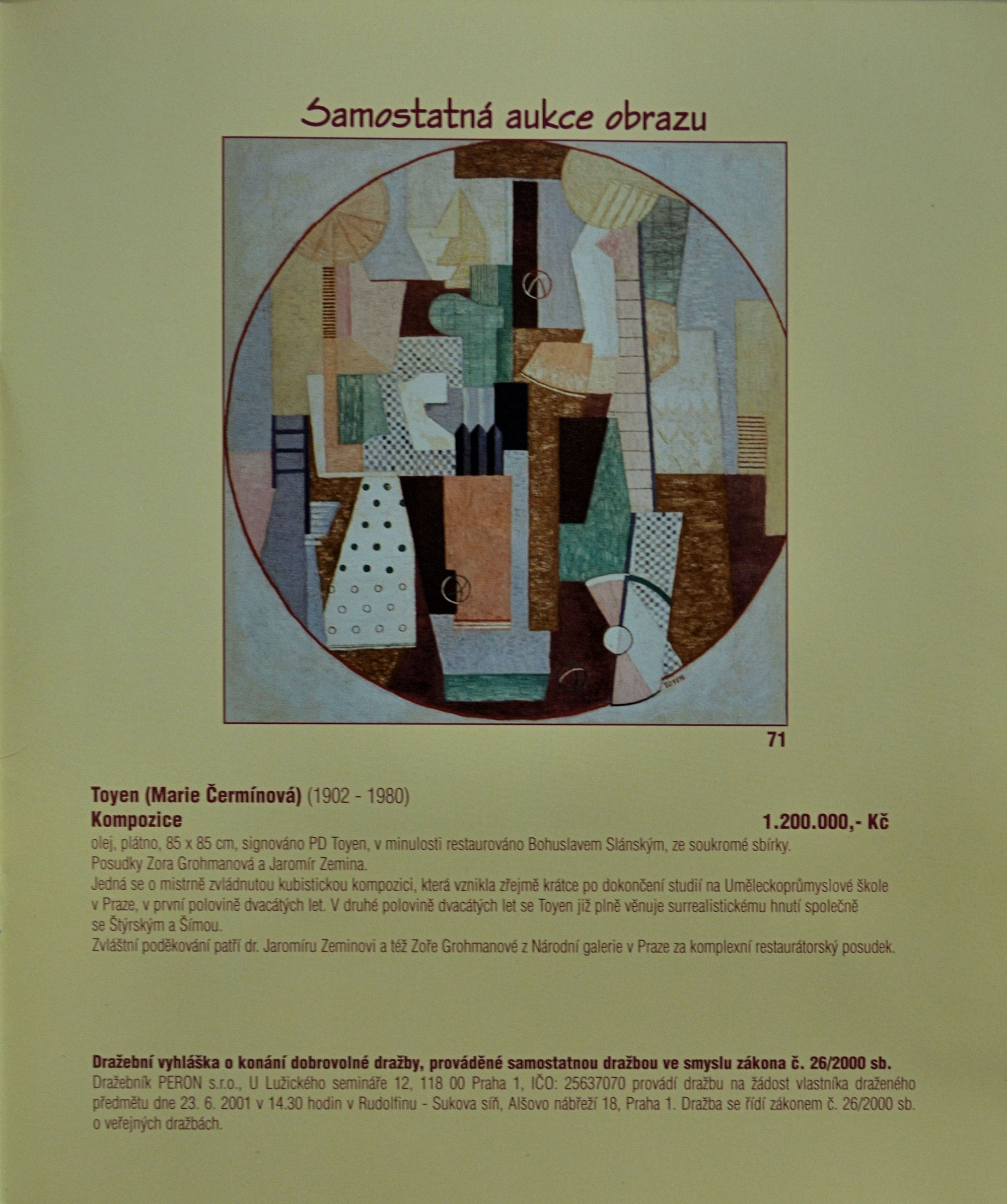 Když galerie začátkem června oznámila, že bude dražit dosud neznámý obraz Toyen, vyvolalo to mezi sběrateli menší pozdvižení. "V našem zájmu bylo nezveřejňovat žádné další informace o majiteli díla, protože hrozilo, že nás případný zájemce obejde a dílo koupí přímo od něj," vysvětloval po aukci spolumajitel galerie Jan Mach. "Okamžitě se však vyskytly hlasy zpochybňující pravost díla, takže jsme museli aspoň částečně poodhalit jeho původ a historii. I když jsme neuvedli, kdo konkrétně obraz dnes vlastní, několik lidí majitele stejně vystopovalo a nabízelo mu za něj částky kolem milionu a půl."