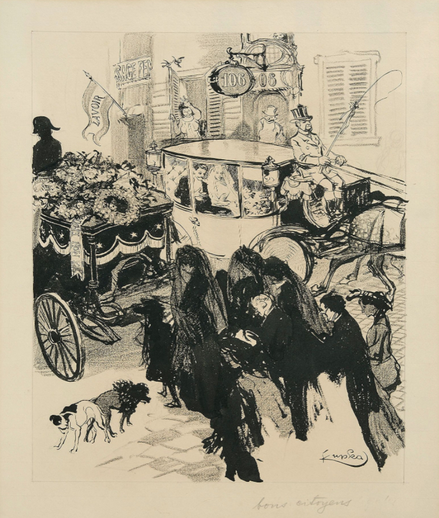 O něco výše, zhruba na 24 až 36 tisíc korun, byl naceněn akvarel pražského rodáka Georga Emmanuela Opitze U veterináře (1000 až 1500 eur). Propracovaný žánrový obrázek s lehkou nadsázkou zachycuje psí mazlíčky s jejich páníčky a paničkami a patrně se váže k Opitzově pobytu v Paříži mezi lety 1814 a 1817. Jako předposlední položka čtvrteční aukce se představí Ctihodní občané Františka Kupky, signovaná mistrovská kresba tuší a uhlem středního formátu s pouliční scénkou dvou míjejících se průvodů, smutečního a svatebního. Organizátoři počítají s prodejní částkou mezi 146 až 195 tisíci korunami (6 až 8 tisíc eur), v rámci celkového finančního odhadu se jedná přibližně o třetí nejdražší kategorii.