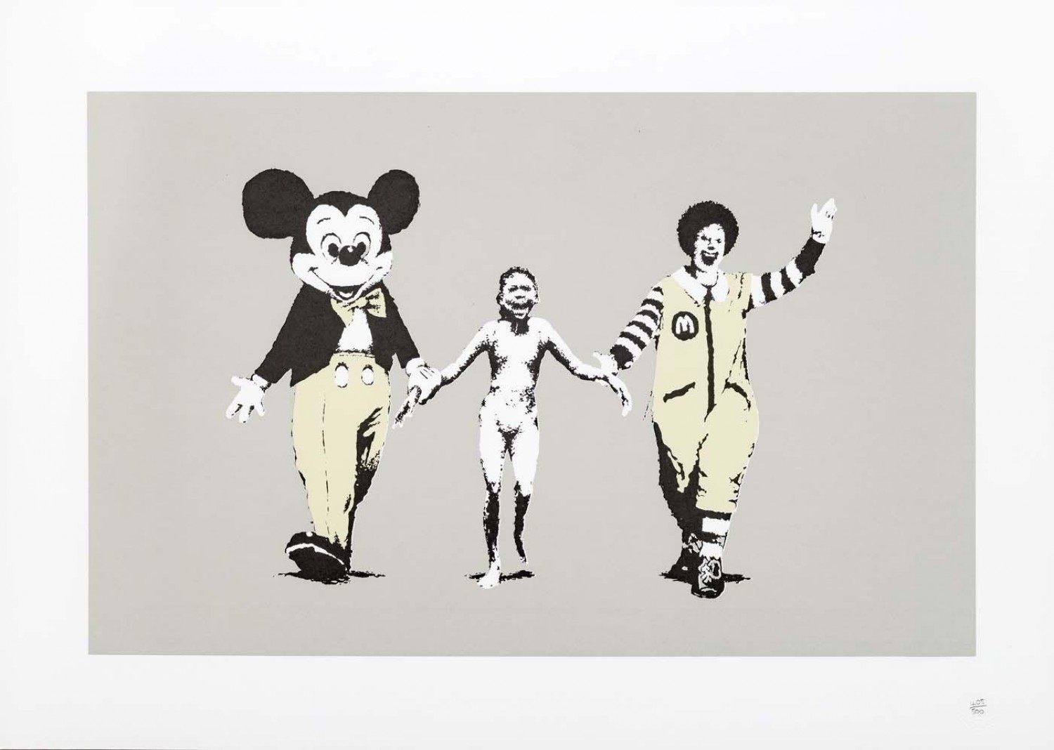 Není divu, že jediným zahraničním zástupcem v jinak domácím žebříčku, je globální superhvězda se skromným vystupováním a skrytou identitou, britský umělec Banksy. Osmačtyřicetiletý streetartový aktivista se vyjadřuje nejčastěji pomocí šablon, sprejů a angažovaných témat již od 90. let. U Galerie Kodl dražený barevný sítotisk Napalm se však jako jedno z mála jeho děl výjimečně neobjevilo přímo na ulici. Originální sérii v počtu 150 signovaných a 500 nesignovaných listů vydalo spřátelené nakladatelství Picture On Walls v roce 2004, obratem následovalo 27 oranžově a 27 duhově kolorovaných exemplářů. Další verzi tisků vytvořil o dva roky později pro výstavu v londýnské Serpentine Gallery, kde se také poprvé objevila velkoformátová obrazová varianta této scény s vietnamskou dívkou, zasaženou napalmovou bombou, a dvěma ikonami americké pop-kultury, myšákem Mickym a Ronaldem McDonaldem. Tehdy ji vlastnil Banksyho o něco starší bristolský kolega Damien Hirst. V květnu nabízený tisk číslovaný 405/500 pochází z roku 2007 a na odhadní cenu mezi 1,2 až 1,6 milionu korun o přibližně pět set tisíc korun nedosáhl. (Přečtěte si více o sériích a prodejních cenách sítotisku Napalm celosvětově.)