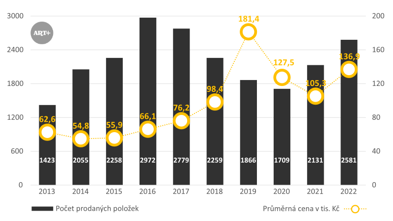 V počtu položek poválečného umění loňský rok nijak zvlášť nevyčníval, i když téměř 2600 katalogových čísel patří za posledních deset let k těm vyšším. Průměrná cena za jedno z nich pak byla druhá nejvyšší, bezmála 137 tisíc korun. Překonal ji pouze rok 2019 s průměrem za jedno dílo  ̶  díky nejvyššímu Medkovu prodeji  ̶  vyšším než 181 tisíc korun.