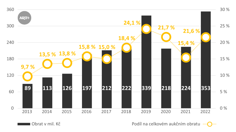 Za posledních deset let se obrat na aukcích za poválečné umění zvednul téměř na čtyřnásobek. V roce 2013 činila celková vydaná částka za tuto kategorii 89 milionů korun. V roce 2016 se dostala již na 197 milionů korun a o tři roky později na zmíněných 339 milionů korun. Propad na částky nad 200 milionů korun zaznamenaly pouze pandemické roky 2020 a 2021.