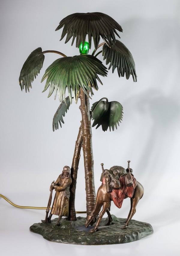 Arabský obchodník se svým velbloudem odpočívající pod palmami - lampa