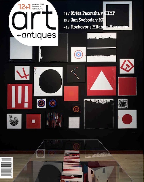Obálka zimního dvojčísla Art+Antiques zve na výstavu Květy Pacovské v pražské Městské knihovně. Vedle toho čtenáři v časopise najdou esej o dílě Jana Svobody, rozhovor s Milanem Houserem nebo aktuální článek o vztahu Akademie věd k umění.