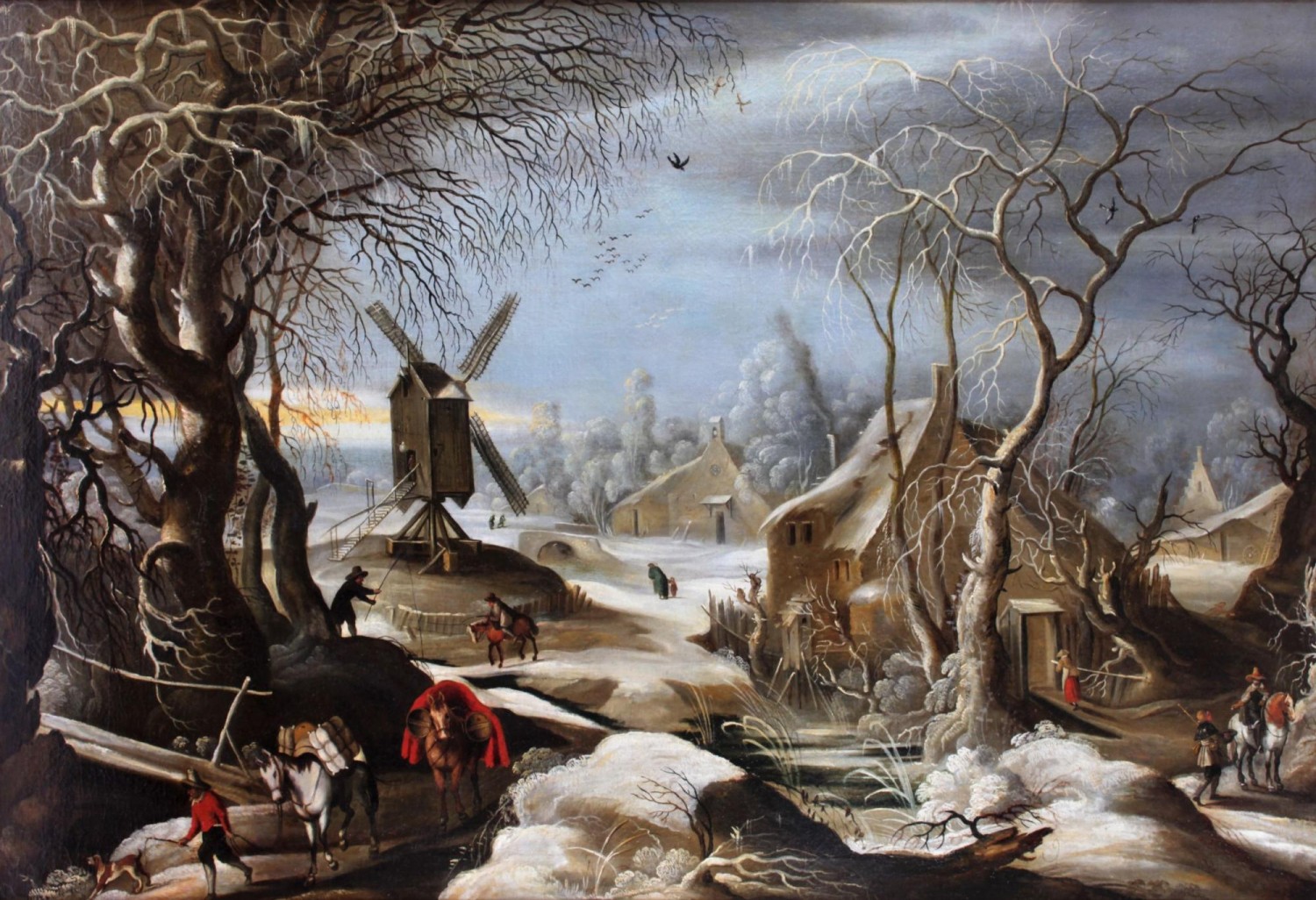 Kompozice obrazu je rozvrstvena do tří prostorových plánů, větrný mlýn se nachází v prostředním z nich. Repusoárový efekt spatřuje Josef Maliva v umístění temného stromu v popředí levé části obrazu a jeho kontrastu se žlutě prosvětlenou oblohou v pozadí. V prvním plánu je zobrazen i muž vedoucí dva koně, na nákladu druhého z nich najdeme špatně čitelnou signaturu JGm (viz obrázek níže). Zimní krajina s větrným mlýnem má v kontextu autorových realizací svými rozměry spíše výjimečné místo, malba je velká 112 na 164 centimetrů, včetně rámu pak 136 na 188 centimetrů. Vyvolávací cena obrazu byla stanovena na 2,6 milionu korun. Odhad počítá s konečnou cenou v rozmezí 4 až 6 milionů korun (vše bez provize).