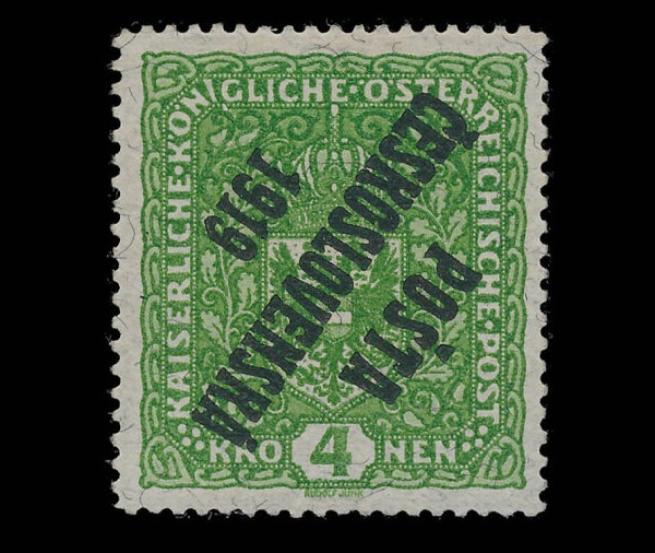 Čtyřkorunová rakousko-uherská známka na žilkovaném papíře s obráceným přetiskem Pošta Československá 1919 se na aukce společnosti Burda Auction začátkem března prodala za rekordních 9,28 milionu korun.